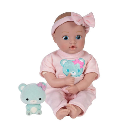 Adora Be Bright Tots & Friends Baby Bear is a baby doll set wearing a pink bow headband and a jersey knit onesie with a front pocket and printed glitter bear graphic that resembles the mini flocked bear toy she arrives with. This soft baby doll is 8.5 inches from head to toe, made for the little hands to hold and love. She has blue eyes, hand-painted hair and cheeks, and an open-mouthed baby expression so she can suck her thumb to help her soothe.