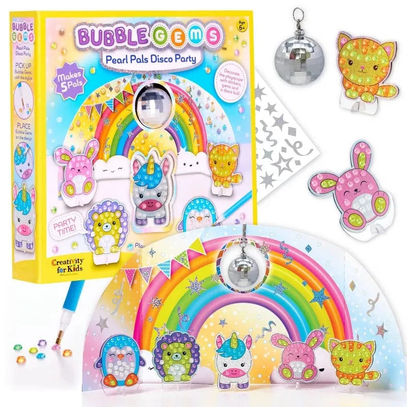 • Include: 5 Pearl pals Unicorn, Bunny, Kitty, Penguin and Hedgehog with stands, 1 Disco playscape, 1 Disco ball, Assorted bubble gems, 1 Foil sticker sheet and Instructions