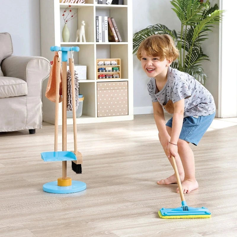 Learn how to keep things clean and tidy with the Clean Up Broom set. With a broom, mop, dustpan, duster, towel, and even a stand to hang your equipment on. You'll have everything you need to keep your home looking spotless. By learning through imitation, your tiny helper can pretend to clean as you clean your home.