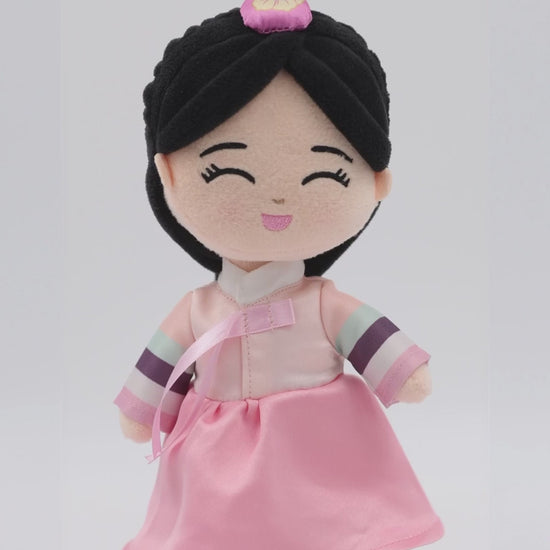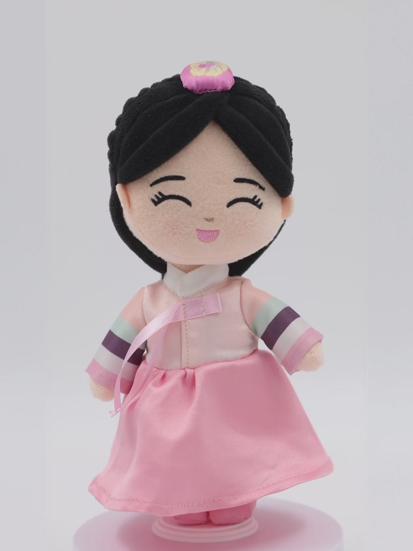 Meet Danbi – a 9” plush doll dressed in a lovely pink hanbok with ribbon and stripe sleeve details. Her name means “sweet rain,” reflecting the gentle beauty of Korean culture. Danbi inspires children to embrace their roots through inclusive play and warm cuddles.