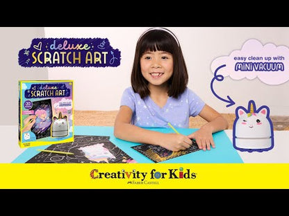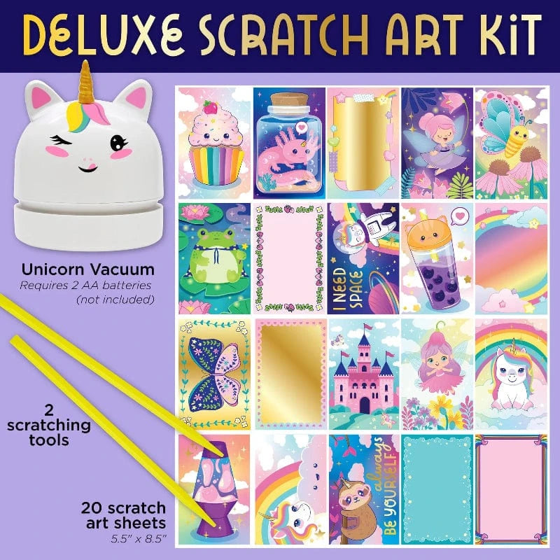 Introducing the NEW Deluxe Scratch Art kit from Creativity for Kids! Create stunning rainbow designs with scratch art sheets, stencils, and tools. But the best part? It comes with an adorable mini unicorn vacuum to make cleanup magical! Say goodbye to scratch art mess and hello to creative fun.