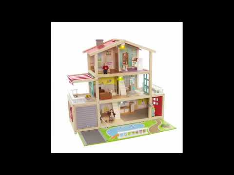 A classic wooden doll house, featuring all the amenities needed for a family of four, is sure to provide endless fun and creative play. A garage, patio with awning, bunk beds and even a door bell are just a few of the details that make this set a playtime favorite.