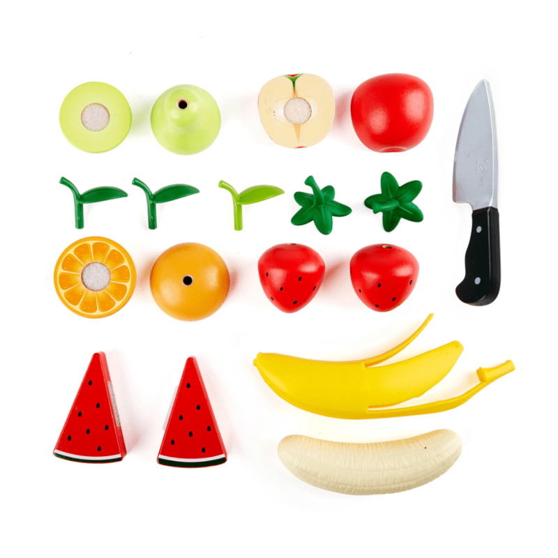 • Includes one realistic play knife, two strawberries, one pear, one orange, one apple, with removable stalks and one slice of watermelon all of which can be sliced with the realistic play knife and one peelable banana.