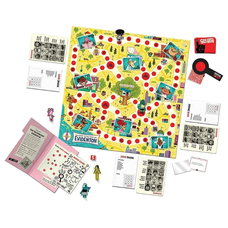 Ready, Detectives? Solve this all-ages WHODUNNIT! Choose the mystery for each game from 40 unsolved case files. Decode clues using your trusty detective gear like your red spy glass, detective mirror, cipher solve card, and even the magic of your own hand! Be the first to identify the culprit and where they are hiding by interviewing neighborhood witnesses and taking notes. BUT be careful! Not all witnesses are telling the truth. Perfect for kids and families!