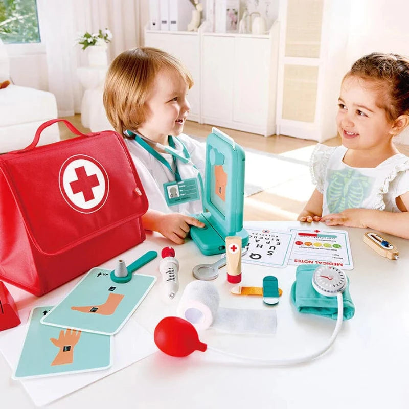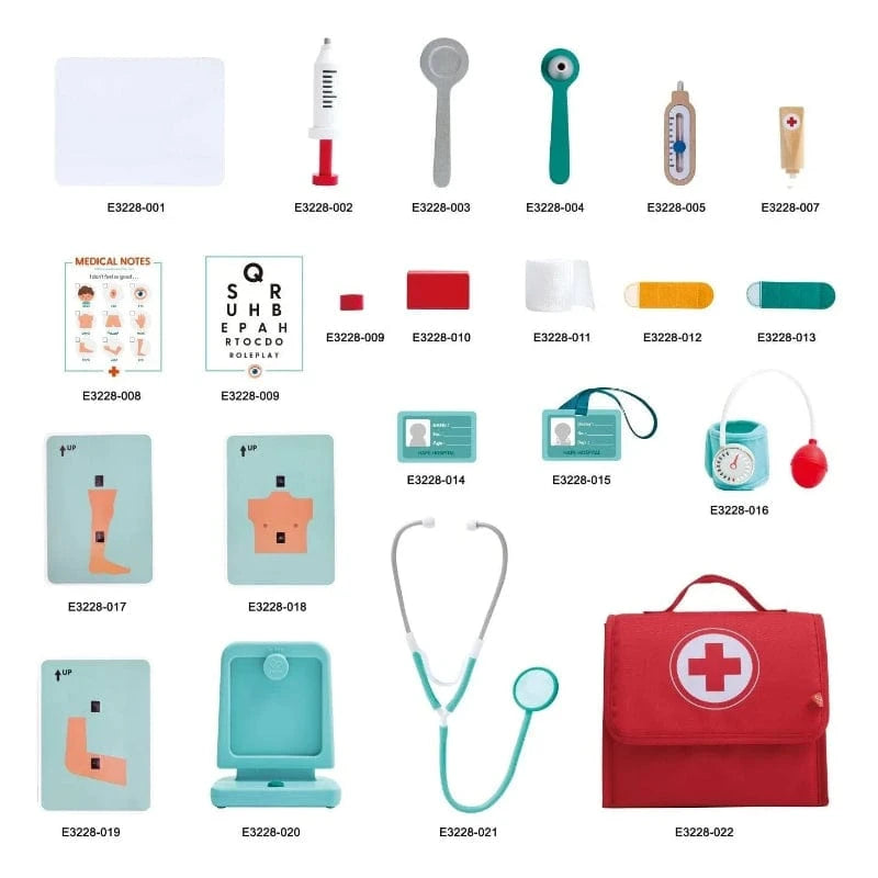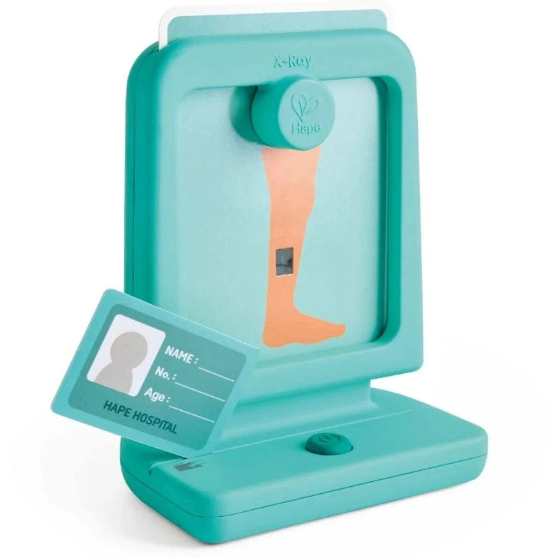 Imitating the scene of doctors' consultations and treatments, including X-ray machines with projection and card swiping functions, simulated stethoscopes, and squeezable blood pressure monitors, equipped with a portable diagnosis and treatment kit.