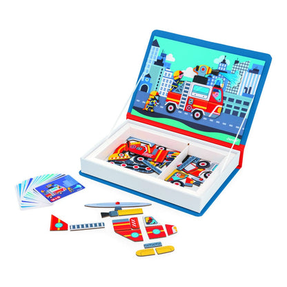 Nee-naw, nee-naw, the fire has spread into the Magnéti'books! This magnetic game will delight children aged 3 years and up, as they are transformed into apprentice firefighters. Thanks to the magnetic backdrop and 60 repositionable magnets, this educational game will stimulate your toddler's imagination as they narrate a whole host of short stories. Children can either adhere to the models provided or are free to invent their own characters. There is no limit to their creativity: the magnets can be mixed and matched at will.