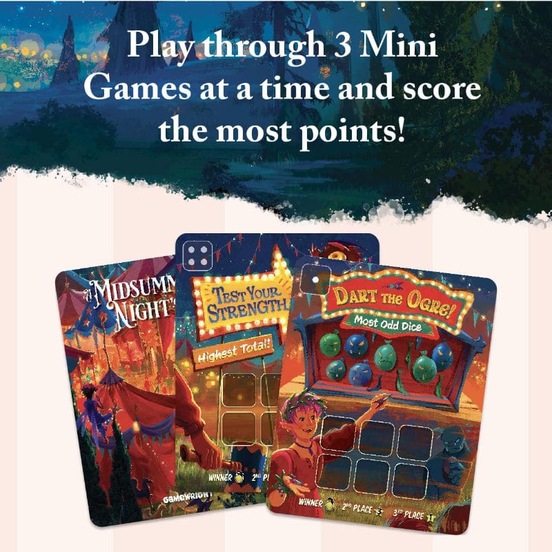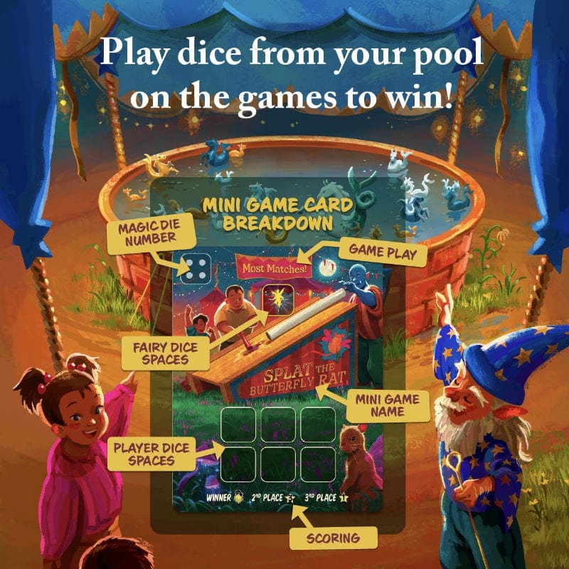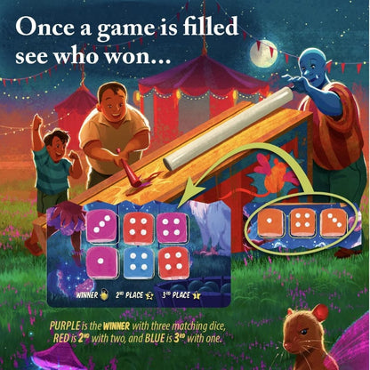 A Fayre has come to town, and all are welcome to enter and partake of its games. But watch out, this is no ordinary Fayre as it is run by elves and fairies. Play 10 mini games, choosing dice to try and achieve the individual victor conditions of those games. Use Fairy Mischief cards to change the dice, and the outcome of the game!