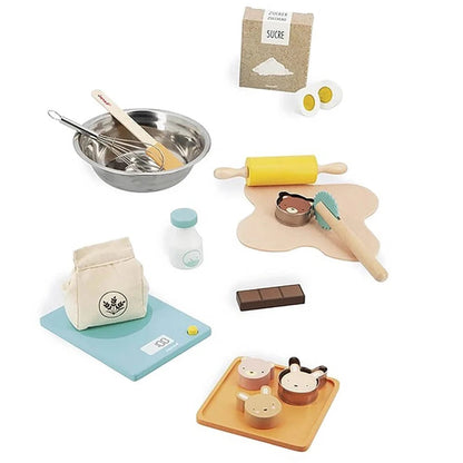 It’s time to make a snack! This baking set will enable your child to become  a real little chef! To make great cakes, you need: an egg, some chocolate,  some sugar, some milk and some flour, as well as 2 cutters shaped like a  rabbit and a bear. Enjoy superb pastries served on a tray. 19 accessories  that are perfect for cooking like grown-ups.