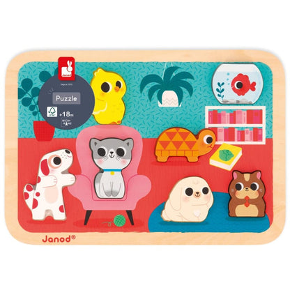 Bubbles the fish does tricks in his bowl while Holly the canary is keeping a close eye on her animal friends! Discover our pet-themed wooden puzzle, designed for babies aged 18 months and up. This early-learning comprises 7 thick pieces that can easily be grasped by little hands. Each element of this puzzle has been carefully designed to represent everyday animals: a dog, cat, tortoise, rabbit, parrot, fish and hamster.