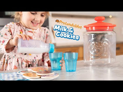 Reach into the jar and grab the cookie of your choice. There's chocolate chip, double chocolate chip, pink with sprinkles, purple with icing swirls, and more. Serve it on a plate. Then, don't forget the milk! The milk inside the bottle flows and disappears as if it's really being poured out! With quality materials and integrated storage, the Pretendables Milk and Cookies Set is a playtime treat that's sure to last.