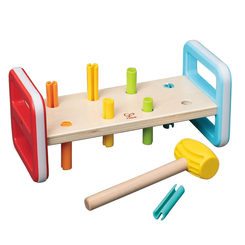 Hape’s Rainbow Pounder teaches children about colors and numbers. Children are encouraged to hammer in the pegs, turn over the bench to hammer them again.
