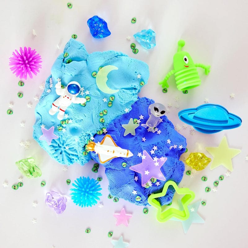 • Includes: 2 Colors of cloud clay 0.2lb total, 1 Astronaut, 1 Rocket, 5 Space rocks, 1 Glow in the dark alien, 1 Squishy alien, 2 Porcupine space balls, 1 Star cookie cutter, 1 Saturn clay stamp, 5 Glow stars, 1 Glow moon, 1 Bag of glow in the dark star confetti, 1 Bag of alien head confetti and Instructions