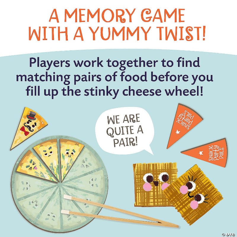 • Includes 1 gameboard, 10 stinky cheese wedges, 1 stinky cheese wheel, 1 magic cheese wedge, 26 snack wedges, 1 pair of tongs, 10 snack board pattern cards and rules
