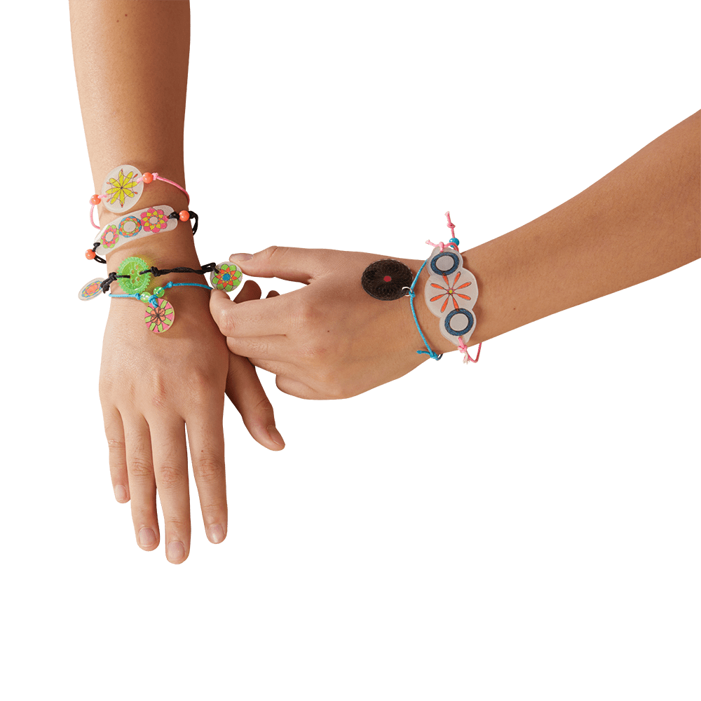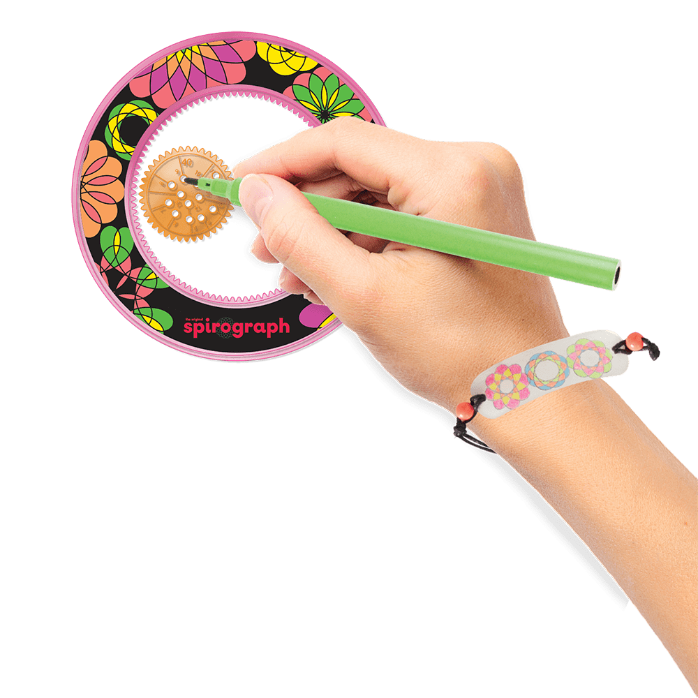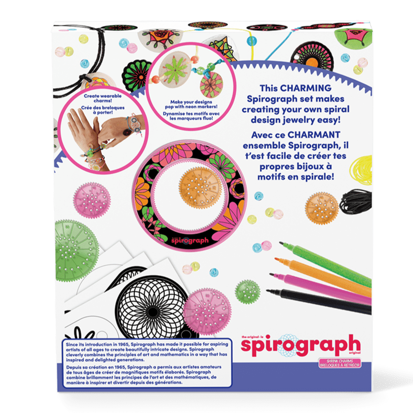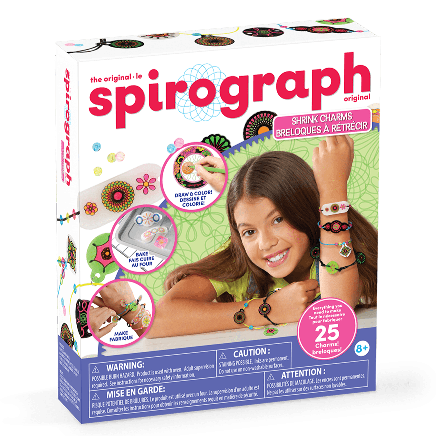 Spirograph just got even more CHARM-ing with Shrink Charms! Make amazingly vibrant, wearable spiral art quickly and easily—just draw, bake, and make! Draw Spirograph designs on shrink paper, color them in with neon markers, and put them in the oven to make the charms. Then, add your handmade charms to jewelry with the included bracelet-making materials. Use the design ideas included in the instructions or come up with your own!