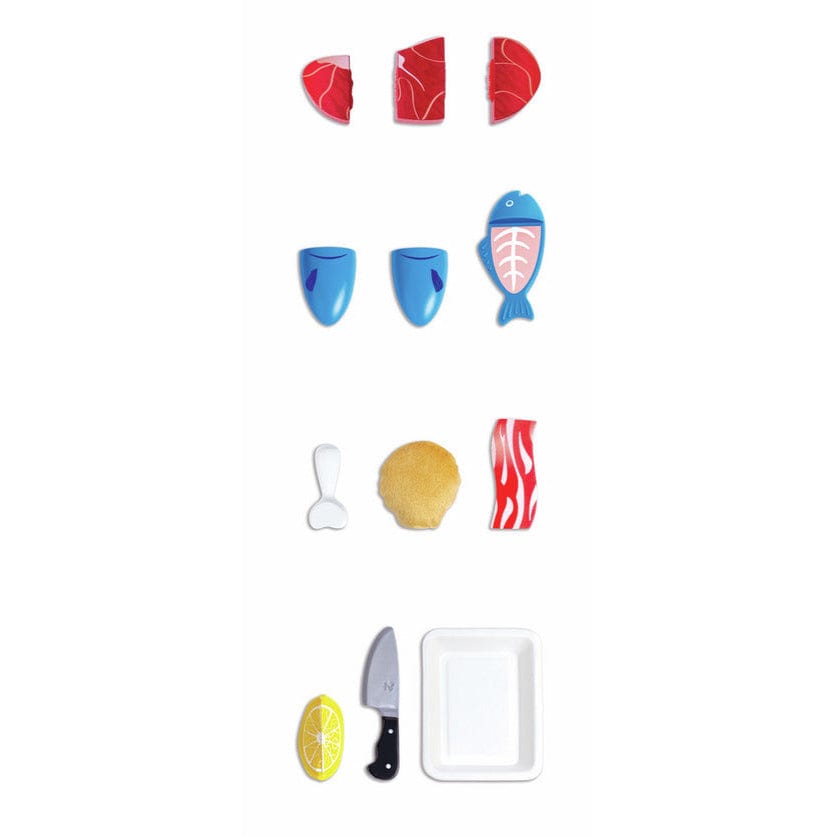 Protein is important for building muscles. Practice preparing foods like beef, chicken, fish and bacon with this realistic kitchen playset. Includes play knife and lemon wedge.