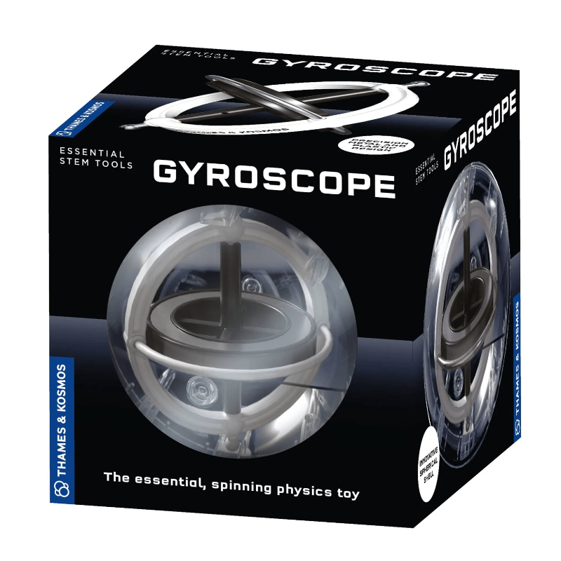 This timeless scientific instrument has been reimagined in a fresh, new design. Experiment with the gyroscope to learn about the physics of motion, forces, and gravity. Learn about gyroscopic forces, and see and feel them in action. Have fun getting your gyroscope to do classic physics tricks. Make the gyroscope balance on a tabletop, on a stand, and on a string. Spin the gyroscope inside the included clear plastic sphere and see and feel the forces acting on the sphere, which doubles as a storage case for your gyroscope.
