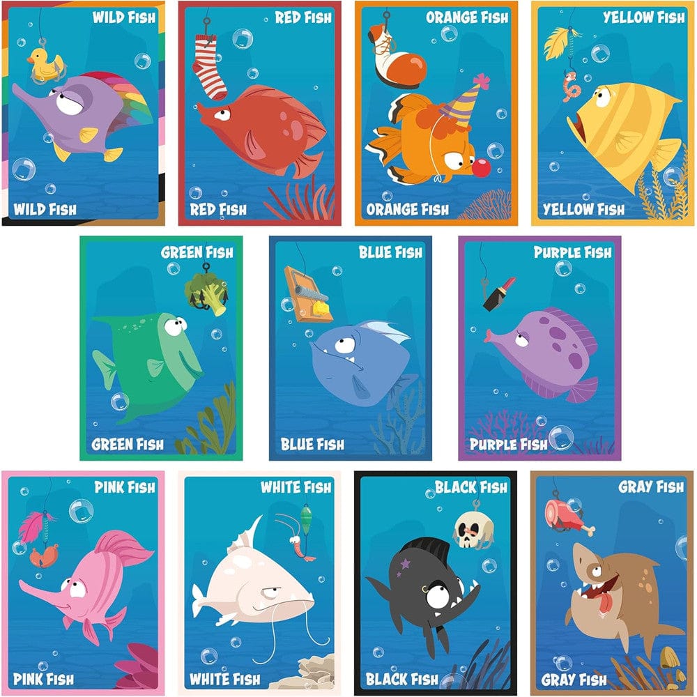 An active twist on a classic! Throw Fish takes the game Go Fish and adds extra play and a fish flinging finale. Players race to collect sets of fish (stacking them on crates), while trying to avoid getting bit by the dog fish or cat fish. If all else fails, you can fling your Throw Fish to try and knock out the opponent's card piles and steal a set.