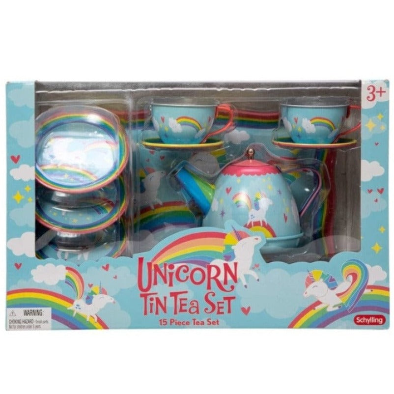 • A beautiful 15 piece tin tea set featuring everyone’s favorite fantasy creature, all wonderfully decorated with whimsical unicorns and rainbows