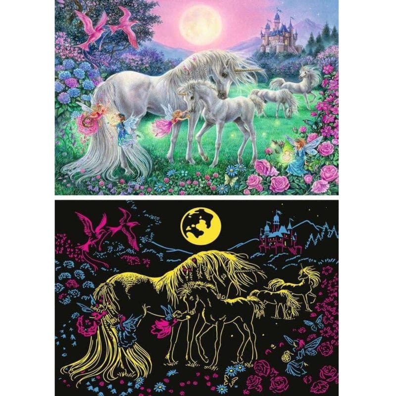 Lights out – puzzle on! The unique Ravensburger Color Star Line puzzles, which shine in several different colours, are just what you need. The fun really begins when the last puzzle piece is inserted. And the excitement grows, because now it’s time for the highlight of this innovation: hold the puzzle up to the light, darken the room and WOW! It shines in red, blue and yellow! Additional fluorescent colors on the surface allow the image to shine in multiple colors.